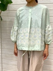胸元はすっきり、裾や袖に上品に刺繍が施され、袖のボリュームが女性らしい一枚。